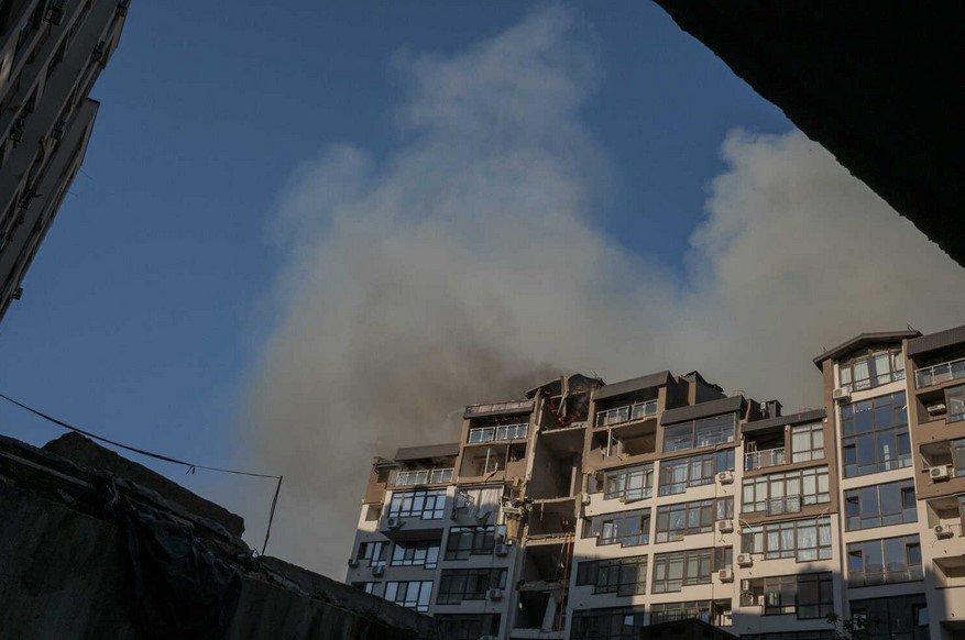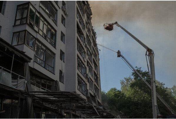 Государственная служба Украины по чрезвычайным ситуациям сообщила, что в районе Лукьяновки загорелся девятиэтажный жилой дом, три верхних этажа которого частично разрушены. В нем говорится, что некоторые жители получили ранения, но не приводится никаких подробностей.