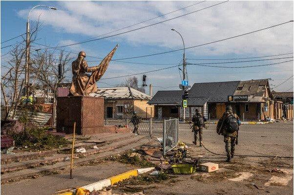 Бойцы украинского объединенного подразделения, состоящего из украинцев и иностранных добровольцев, включая британцев и американцев, во время мартовской операции в Ирпене. Фото… Даниэль Берегулак для The New York Times