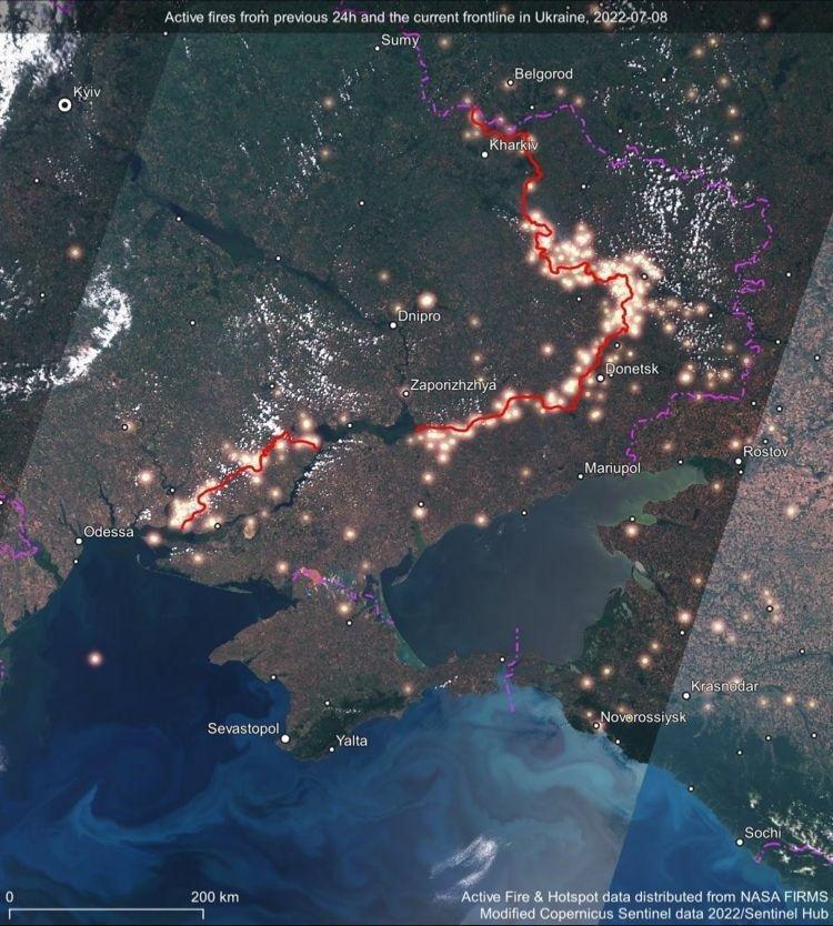 Протягом минулого тижня на території України щодня фіксувалися численні пожежі у лісах та на полях через обстріли. Система NASA FIRMS (Fire Information for Resource Management System), яка займається виявленням великих пожеж, зафіксувала найгарячіші точки вздовж лінії фронту на території України. Чи не найбільше пожеж за тривалий час у NASA задокументували 8 липня. Зокрема на супутникових знімках видно масштабні займання у Луганській, Донецькій і частині Харківської області, а також на півдні – на Миколаївщині та Херсонщині.