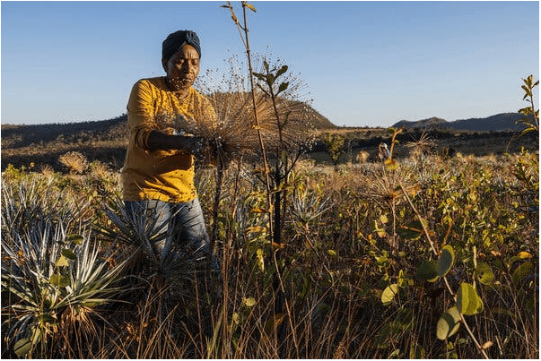 Женщины и мужчины, составлявшие эту команду лесных плантаторов, все были калунга, потомками порабощенных людей, которые столетия назад бежали в бразильское серрадо, обширный регион лугов, саванн и редколесий, покрывающий большую часть южной половины страны. Расположенные среди неприступных столовых гор Гояса, деревни Калунга оставались в значительной степени изолированными от внешнего мира до 1980-х годов. Первыми прибыли антропологи, затем учителя. Руководитель группы посадки, Дамиан Сантос, аккуратный, медитативный мужчина 37 лет, помнит, когда появились первые туристы, привлеченные близлежащими водопадами. Все больше и больше глиняная черепица и кирпич использовались в качестве строительных материалов вместо традиционных лонжеронов и листьев пальмы бурити. В село пришло электричество. Затем, год назад, в районе появилась организация, предлагающая деревья.