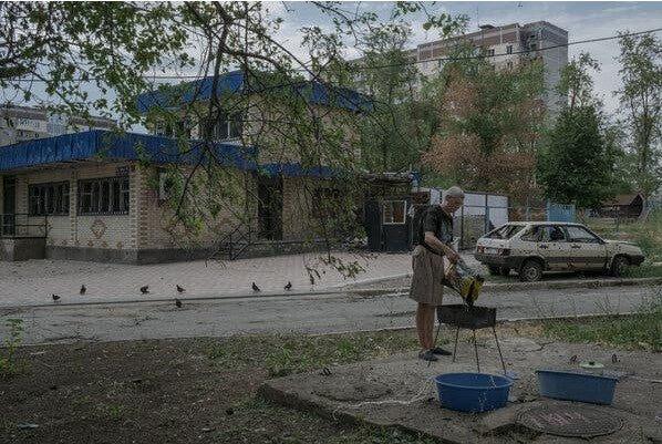65-летний шахтер на пенсии Владимир сидел на скамейке во дворе с северной стороны здания, которое, как узнали местные жители, лучше защищено от российской артиллерии. «Я и не думал уходить, — сказал он. «Здесь похоронена моя жена, и я останусь с ней».