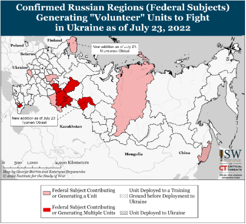 Кремль продолжает усилия по формированию региональных добровольческих батальонов. 23 июля пресс-секретарь Главного разведывательного управления Украины (ГУР) Вадим Скибицкий дал интервью Радио Свободная Европа (РФЕРЛ), в котором указал, что Кремль планирует до конца этого месяца сформировать 16 новых добровольческих батальонов. Скибицкий также отметил, что Кремль формирует еще один корпус в Мулино Нижегородской области, что, по-видимому, подтверждает прежние заявления бывшего командующего силами обороны Киева Александра Павлюка о том, что Россия формирует 3-й армейский корпус (силы Донецкой и Луганской Народных Республик в настоящее время составляют 1-й и 2-й армейские корпуса соответственно) численностью до 15 000 военнослужащих. Скибитский заявил, что по состоянию на 23 июля уже сформировано восемь добровольческих батальонов. Кремль еще не сформировал добровольческий батальон в Санкт-Петербурге, на родине президента России Владимира Путина.