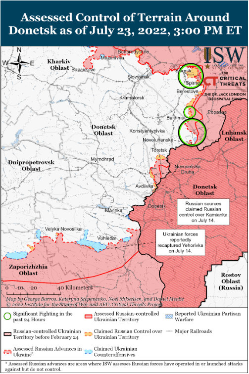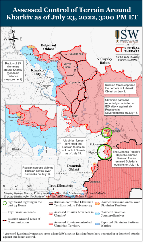 Украинские силы, вероятно, готовятся начать или уже начали контрнаступление в Херсонской области по состоянию на 23 июля, но информация из открытых источников о ходе и темпах контрнаступления, вероятно, будет ограниченной и будет отставать от событий. Советник Херсонской областной администрации Украины Сергей Хлан заявил 23 июля, что украинские силы захватили неуказанные населенные пункты в Херсонской области, но призвал мирных жителей Украины хранить молчание о ходе контрнаступления до официальных заявлений украинских властей. Репортер по вопросам национальной безопасности внешней политики Джек Детч сообщил 22 июля, что неназванный высокопоставленный представитель министерства обороны США заявил, что украинские силы отбили неуказанные «части оккупированных Россией сел» в Херсоне за последнюю неделю с 15 по 22 июля, что указывает на то, что украинские силы совершили некоторые неуказанные территориальные продвижения вдоль линии фронта. Район между линией фронта и городом Херсон является сельским и в основном состоит из небольших населенных пунктов, которые с меньшей вероятностью сообщают о передвижении войск и боях, что позволяет изменить контроль над местностью в этом районе без каких-либо доказательств, появляющихся в отчетах из открытых источников. У российских властей также нет стимула сообщать о территориальных приобретениях Украины. Таким образом, информационная динамика, которая позволяет ISW сообщать о российских наступательных операциях с относительно небольшим запаздыванием, в этой ситуации инвертируется. ISW будет сообщать о ходе любого украинского контрнаступления в меру своих возможностей в рамках этих ограничений.