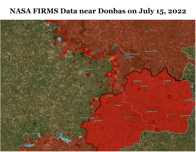 Источник: пожарная информация НАСА для системы управления ресурсами над Донбассом, 15–23 июля, а также Esri, Maxar, Earthstar Geographics и сообщество пользователей ГИС.]