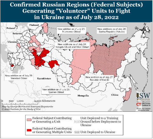 Субъекты Российской Федерации продолжали формировать добровольческие батальоны на региональной основе. Российское издание «Без Формата» сообщило 28 июля, что батальон «Боотур» из восточной части российской Республики Саха (также известный как «Якутия») был сформирован из 105 добровольцев для развертывания в Украине. В частности, ГУР сообщило, что военнослужащие из восточных регионов, таких как Якутия, не хотят участвовать в войне в Украине отчасти из-за того, что эти добровольческие формирования не формируются на профессиональной основе. ISW обновила карту добровольческих батальонов, чтобы отразить события в Республике Саха.
