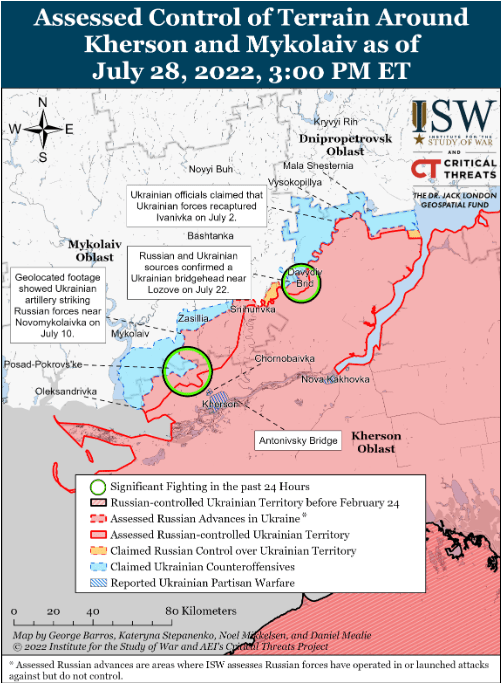 28 июля украинские силы продолжили наносить удары по российской военной инфраструктуре на южном направлении. Мэр Мелитополя Иван Федоров сообщил, что украинские силы нанесли удар по Мелитопольскому аэродрому после того, как российские силы начали ремонт аэродрома после ударов 23-24 июля. Федоров заявил, что российские войска используют аэродром как перевалочный пункт для доставки вооружения и техники. Украинские силы, вероятно, нанесли удар по российской военной инфраструктуре в Чернобаевке на северной окраине Херсона. На кадрах Чернобаевки виден большой столб дыма, поднимающийся над городом, а глава Херсонской областной администрации Украины Сергей Хлан опубликовал фотографию столба дыма с подписью, предполагающей, что украинские силы нанесли успешный удар.