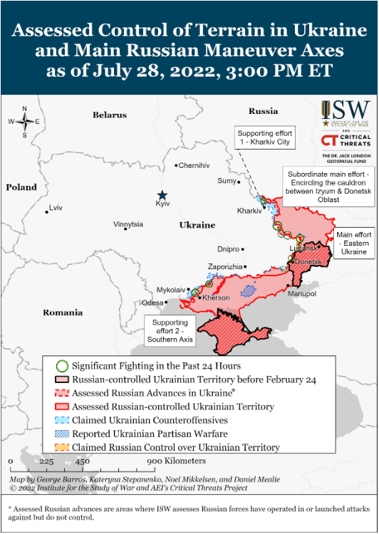 Российские войска не добились территориальных успехов на харьковском направлении 28 июля, но, возможно, создают условия для возобновления наступательных операций на харьковском направлении. Дергачевский городской совет сообщил, что украинские и российские войска продолжают боевые действия в Козачьей Лопани, Цуповке, Дементьевке и Великих Проходах к северу от Харькова. Российский Telegram-канал «Рыбарь» утверждал, что российские войска провели успешные рейды по украинским позициям в районе Борщовой, Сосновки и Петровки, что впоследствии могло позволить российским силам продвинуться на Харьков от выступа Русской Лозовой до Борщова, примерно в 28 км к северо-востоку от Харькова. Российские войска нанесли авиаудар в районе Русских Тышек, примерно в 25 км к северу от Харькова, и продолжали наносить артиллерийские и ракетные удары по Харькову и населенным пунктам к северу, северо-востоку и юго-востоку. Успешные российские наступательные операции в Харькове крайне маловероятны, но русские, скорее всего, попытаются закрепиться в области еще до сентябрьских референдумов.