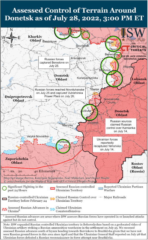 28 июля российские войска провели серию ограниченных наземных атак к северо-западу от Славянска. Украинский Генеральный штаб сообщил, что российские войска провели безуспешную попытку боевой разведки возле Бражковки, примерно в 25 км к северо-западу от Славянска на оспариваемой территории. Сообщается также, что российские войска пытались продвинуться из района Довеньке в Мазанивку, примерно в 20 км к северо-западу от Славянска, и из Пасики в Долину, примерно в 20 км к северо-западу от Славянска. 27 июля украинский Генштаб сообщил, что российская разведывательная группа действовала вблизи украинских позиций в Пасике, что, по-видимому, предполагает ограниченную контратаку украинских войск в этом районе. Однако сообщения о попытке русских продвинуться к юго-западу от Пасики в направлении Долины подтверждают контроль ISW над оценкой местности, согласно которой Пасика остается на территории, контролируемой Россией. Кроме того, российские силы продолжали обстрел населенных пунктов к северо-западу от Славянска вдоль границы Харьковско-Донецкой области и к северо-востоку от Славянска в районе Пришиба и Татьяновки.