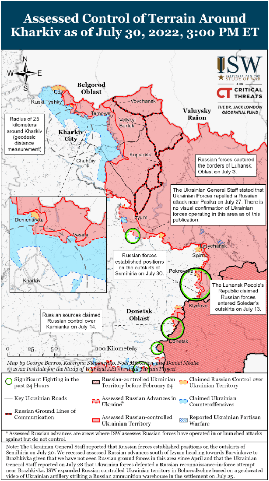 Российские войска возобновили наступательные операции к юго-западу от Изюма и начали накапливать военную технику в Белгородской области, к востоку от российских сухопутных коммуникаций (НЛКС) с Изюмом. Украинский генеральный штаб сообщил, что 30 июля российские войска безуспешно атаковали Бражёвку и Дмитровку, примерно в 16 и 18 км к юго-западу от Изюма соответственно. На кадрах с геолокацией также видно, как украинские силы нанесли удар противотанковой управляемой ракетой по наступающему российскому танку в Браживке в неустановленную дату. На спутниковых снимках с географической привязкой показано наращивание российской военной мощи в период с 19 июня по 28 июля в Уразово Белгородской области, в 12 км к востоку от межгосударственной границы. Российские силы могут наращивать военную технику в этом районе для поддержки наступления из Изюма на запад, так как наращивание войск находится всего в 55 км к северо-востоку от российских опорных пунктов в Купянске, которые соединяются как с Изюмом, так и с населенными пунктами к югу от Харькова. Российские силы недавно предприняли несколько локальных атак к северо-западу от нынешней линии Изюм-Славянск, а наземные атаки к юго-западу от этой линии наряду с наращиванием военного потенциала могут поддержать наступательную операцию в западном направлении.