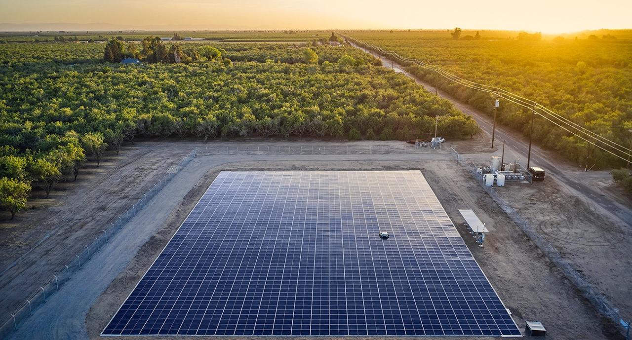 С земли новая солнечная ферма мерцает, как мираж оазисf в жаркий летний день. Вместо косых рядов блестящих панелей, тянущихся выше кукурузы, этот массив, установленный прямо на земле, лежит ровно и напоминает водную поверхность. С воздуха это выглядит как бассейн размером с акр. Тем не менее, несмотря на свои скромные размеры, этот новый тип фотоэлектрической установки — одна из пяти, производящих в настоящее время совокупную мощность 2,5 мегаватта энергии. В Центральной долине Калифорнии она может сравниться по мощности с обычными солнечными фермами почти в три раза большими по размеру.