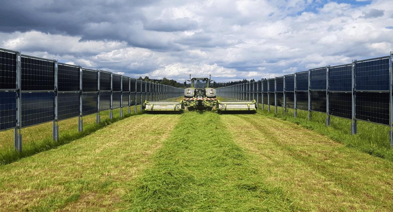 На лугу на юго-западе Германии солнечные батареи стоят вертикально, выстроившись в длинные тонкие ряды, как ряд заборов. Пока фермеры возделывают сено на широких пространствах между рядами, вертикальная электростанция вырабатывает безуглеродную электроэнергию для близлежащего города.