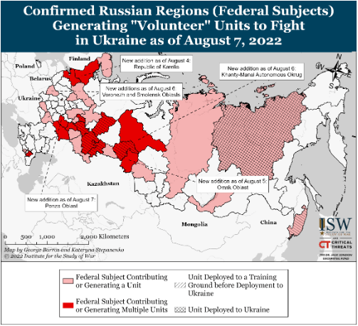 Кремль может назначить разные типы голосования в разных оккупированных районах в зависимости от предполагаемой поддержки местного населения, предполагаемого риска партизанских нападений и бюрократических возможностей. Например, украинский глава Луганской областной военно-гражданской администрации Сергей Гайдай сообщил 7 августа, что российские оккупационные власти в Луганской области определили места для личного проведения фиктивного референдума об аннексии. Гайдай сообщил, что российские оккупационные власти активно агитируют за аннексию, распространяя пропагандистские газеты и привязывая предоставление гуманитарной помощи, включая продукты питания, воду и строительные материалы, к участию в псевдореферендуме. Гайдай сказал, что эта практика равносильна шантажу: «мы [россияне] поможем вам [гражданам Украины] удовлетворить ваши основные потребности, пока вы идете на «референдум». В противном случае умрите, а мы сфабрикуем результат без вас». Россия оккупировала часть Луганской области с 2014 года и, вероятно, имеет больше возможностей для мобилизации коллаборационистов для управления избирательными участками, чем на недавно оккупированных территориях. 3 августа ISW сообщила, что оккупационные власти в Донецкой области могут разрешить личное и онлайн-участие, предоставляя российским властям несколько рычагов для изменения результатов.