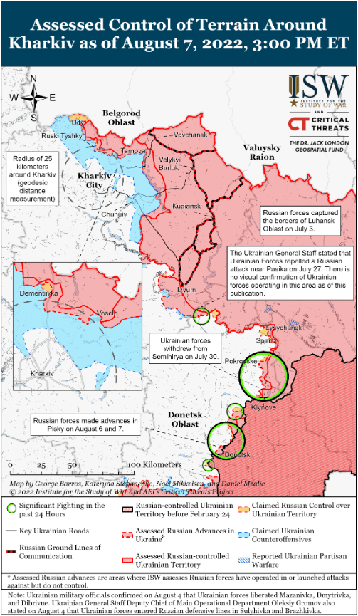7 августа российские войска не проводили подтвержденных наземных атак к северо-западу от Изюма. На опубликованных 7 августа в социальных сетях изображениях видно, что подразделения 5-й танковой бригады и 37-й мотострелковой бригады действуют в неустановленных местах на изюмском направлении, что указывает на то, что группировка Восточного военного округа продолжает действовать на изюмском направлении.