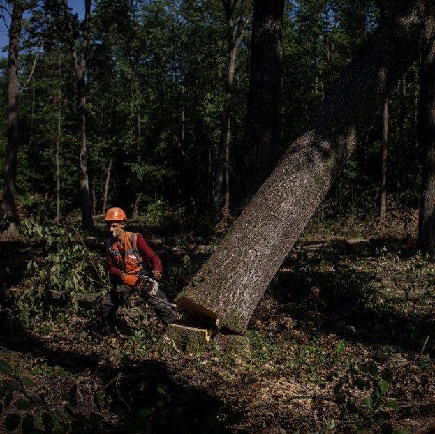 Львов, Украина — В густом лесном парке, окаймленном многоквартирными домами и детской площадкой, в последний день с десяток рабочих были заняты цепными пилами и топорами, валкой деревьев, рубкой бревен и рубкой их на дрова, чтобы уложить их в скрытых сараях по всему Львову, крупнейшему городу Западной Украины.