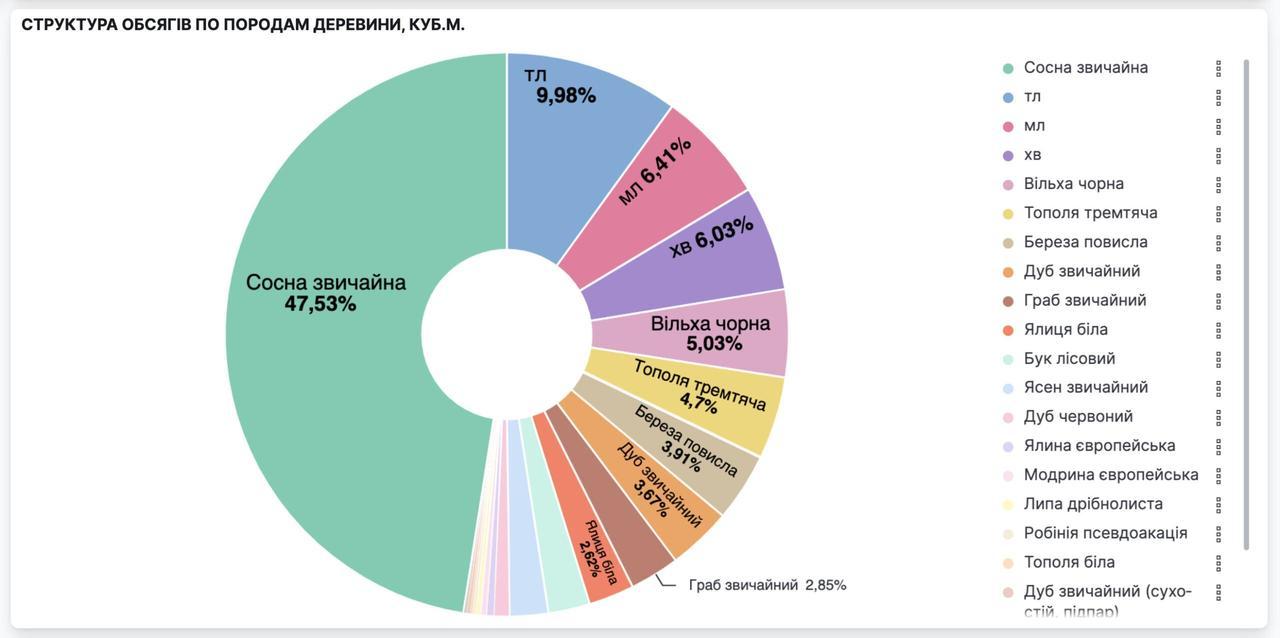 На ринку найбільший попит мала сосна звичайна, твердолистяні та м’яколистяні породи деревини дров’яної. Частка їх реалізації у загальній структурі склала 47,5%, 10% і 6,4% відповідно.