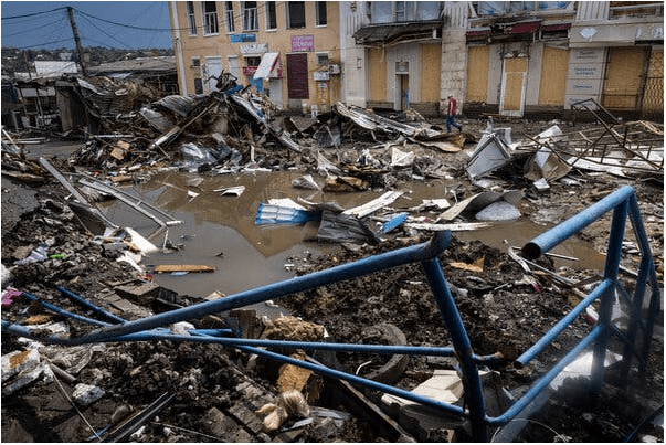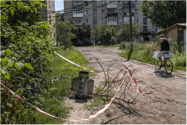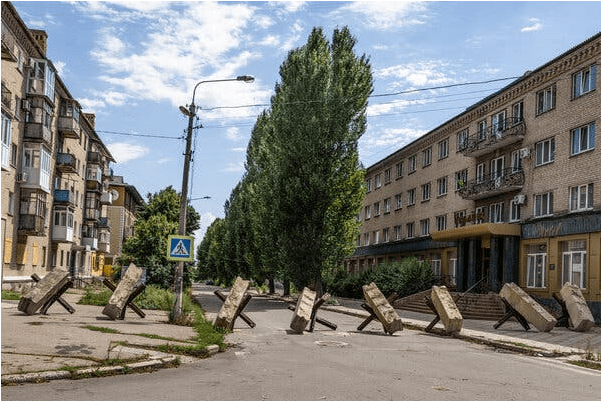 Заместитель мэра Александр Марченко сказал в интервью, что русские приближались с трех сторон примерно в шести милях от города, указывая на дым от горящих близлежащих деревень. Уличный рынок превратился в груду скрученных металлических листов от стертых с лица земли прилавков. На одном заднем дворе рядом со свежей воронкой от снаряда лежало тело под простыней.