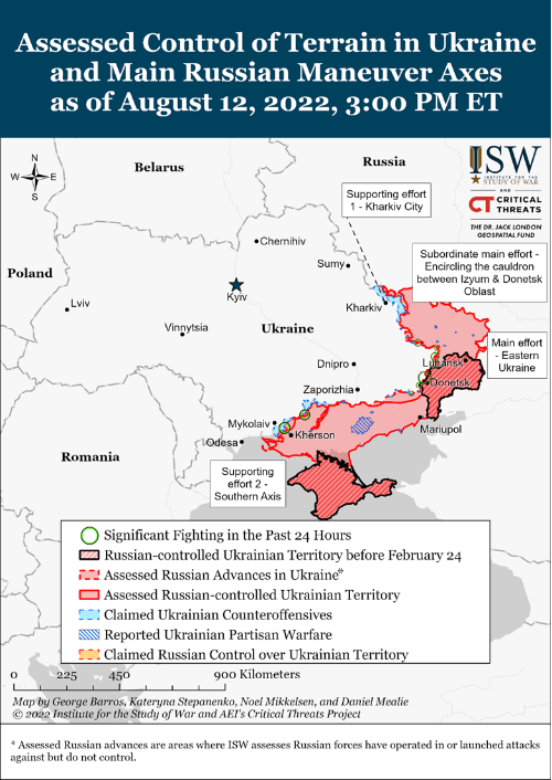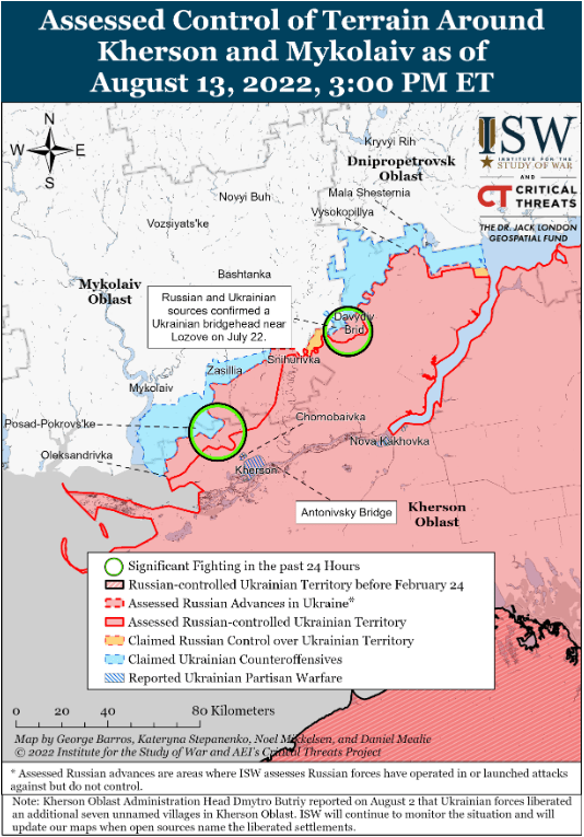 Украинские силы продолжают попытки нарушить российские наземные линии связи (GLOC), которые поддерживают российские силы на правом берегу Днепра. Украинские силы снова нанесли удар по мосту на плотине Каховской ГЭС 13 августа, что, как сообщается, сделало мост непригодным для движения большегрузной техники. Ранее 10 августа Южное оперативное командование Украины сообщило о непригодности моста через плотину Каховской ГЭС. Каховский мост был единственным автомобильным мостом, который российские войска могли использовать после успешных попыток украинских войск вывести из строя Антоновский автомобильный мост. Министерство обороны Великобритании заявило, что у российских сил сейчас нет мостов, по которым можно было бы перебросить тяжелую технику или припасы через реку Днепр в Херсонской области, и они должны полагаться в основном на понтонный паром, который они установили возле Антоновского автодорожного моста. В настоящее время ISW не может подтвердить, могут ли российские войска использовать Антоновский железнодорожный мост для пополнения сил на правом берегу Днепра.