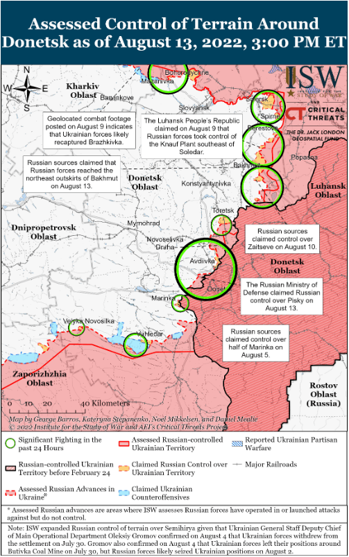 13 августа российские силы нанесли несколько наземных ударов к северу и юго-западу от Донецка. Украинский Генштаб сообщил, что российские войска пытались продвинуться через украинские оборонительные рубежи в Александрополе и Красногоровке – в 30 км и 23 км к северу от Донецка соответственно. Кроме того, российские войска попытались продвинуться к Авдеевке со стороны «Спартака», примерно в 4 км к югу от Авдеевки. Данные украинского Генерального штаба о российских атаках к северу и югу от Авдеевки согласуются с заявлением российского источника о том, что российские войска пытаются сосредоточить внимание на окружении Авдеевки с юга и севера, чтобы извлечь выгоду из недавних достижений вокруг Песков и компенсировать наступательные операции на линии Авдеевка-Донецк, которые вообще зашли в тупик. Кроме того, российские войска пытались улучшить свои тактические позиции вблизи границы Донецко-Запорожской области и наносили удары по наземным целям к юго-западу от Донецка в районе Павловки и Новоселки.