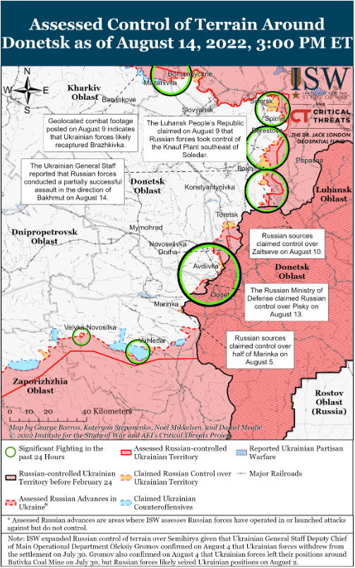 14 августа российские войска нанесли наземные удары к северу и северо-западу от Донецка. Украинский Генштаб сообщил, что украинские войска отразили атаку российских войск на Красногоровку, примерно в 20 км к северу от окраин Донецка. Пресс-секретарь Восточного командования Украины Сергей Череватый, в частности, оспорил заявление Минобороны России от 13 августа о том, что российские войска взяли под полный контроль Пески. Череватый заявил, что российские силы все еще ведут активные боевые действия в Песках и в направлении Первомайского (примерно в 10 км к северо-западу от Песков по трассе E50), но украинские войска сохраняют контроль над городом. Утверждение Череватого подтверждается кадрами с геолокацией российского удара по зданию в Песках, из которых следует, что русские по-прежнему нацелены на украинские войска в населенном пункте, а не полностью его контролируют. Российские источники также утверждали, что войска Донецкой Народной Республики (ДНР) начали боевые действия в направлении Невельского, всего в 1 км к западу от Песков. Хотя российские силы, вероятно, не полностью очистили Пески, они, вероятно, укрепляют свои позиции, чтобы начать дальнейшие атаки на запад.