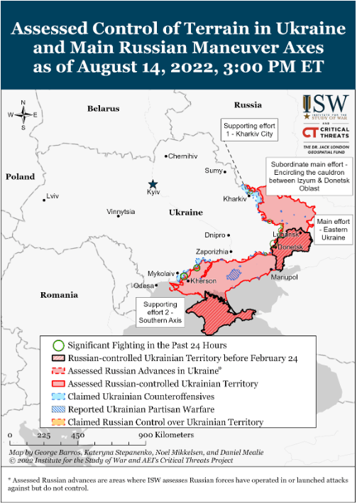 Сорок два государства, в том числе все члены Европейского Союза, опубликовали совместное заявление, в котором призвали Россию немедленно уйти с Запорожской атомной электростанции (АЭС) в оккупированном Энергодаре, Запорожская область, около 05:00-06:00 по восточному времени 14 августа, всего от двух до четырех часов, прежде чем были нанесены новые удары по городу. Источники в правительстве Украины сообщили, что российские силы произвели шесть выстрелов по Энергодару в 15:00-15:30 по украинскому времени (08:00-08:30 по восточному времени) 14 августа, в результате чего погиб сотрудник АЭС. Российские источники обвинили украинские силы в нанесении ударов по АЭС с помощью дронов-камикадзе иностранного производства, ракет GMLRS и артиллерийских систем НАТО. 13 августа ISW сообщила, что на кадрах с геолокацией видно, что российская 203-мм артиллерийская система «Пион» действует примерно в 11 км от Запорожской АЭС.