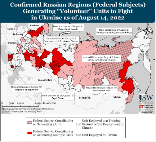 Российские местные СМИ сообщили о дополнительном добровольческом подразделении, которое присоединится к недавно объявленному 3-му армейскому корпусу. Сообщается, что новосибирский добровольческий батальон «Вега» 12 августа принял участие в торжественной церемонии по поводу своего развертывания в неустановленном районе. Местные СМИ продолжали рекламировать преимущества службы по контракту в добровольческих батальонах, предполагая, что Новосибирская область еще не выполнила свою квоту на набор новобранцев. Ранее ISW заявляла, что добровольческие батальоны Пензенской и Самарской областей будут входить в состав 3-го армейского корпуса, что также подтверждает первоначальную оценку ISW о том, что новый 3-й армейский корпус будет, по крайней мере, частично состоять из новобранцев.