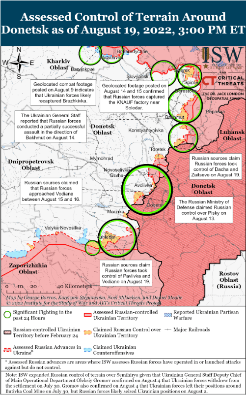 19 августа российские войска провели ограниченную наземную атаку юго-западнее Донецка в направлении границы Донецко-Запорожской области. Генштаб Украины сообщил, что российские войска пытались улучшить свои тактические позиции в районе Новомихайловки, в 25 км к юго-западу от Донецка. Российские источники также утверждали, что российские войска, как сообщается, двинулись для поддержки окружения Угледара (45 км к юго-западу от Донецка) и взяли под свой контроль близлежащие населенные пункты Павловка и Водяное. Хотя ISW не может самостоятельно проверить эти заявления, российские силы, скорее всего, продолжат операции в районе Угледара, чтобы получить доступ к дороге, ведущей на северо-восток в Марьинку, чтобы поддержать усилия по продвижению к западу от Донецка.