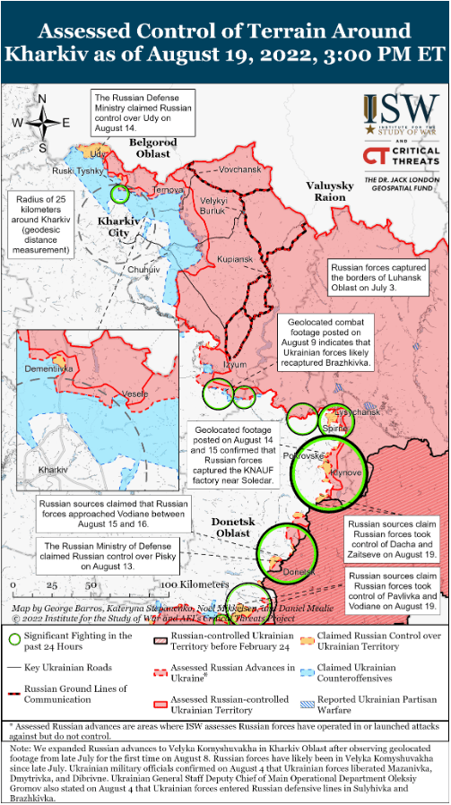 19 августа российские войска предприняли попытку ограниченного наземного наступления к северу от Харькова в районе Питомника и обстреляли Харьков и близлежащие населенные пункты. Министерство обороны Великобритании (МО Великобритании) сообщило, что, несмотря на ограниченное присутствие российских сил на направлении города Харьков, российские войска с начала войны постоянно обстреливали город Харьков и проводили небольшие наземные атаки, чтобы помешать украинским силам передислоцировать личный состав с этого направления на другие направления. Отчет Минобороны Великобритании подтверждает предыдущие оценки ISW относительно ограниченного внимания России к городу Харькову и срыва атак к северу от города. Российские силы нанесли авиаудары по Старому Салтову и дистанционно заминировали Верхний Салтов и Старый Салтов к северо-востоку от Харькова на левом берегу реки Северский Донец.