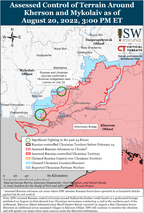 20 августа российские войска предприняли несколько атак к северо-западу от города Херсон и к востоку от города Николаев. Украинские военные сообщили, что российский взвод безуспешно пытался продвинуться к Таврическому, примерно в 38 км к северо-западу от города Херсон. Два российских десантно-штурмовых отряда также не смогли продвинуться к Партизанскому, примерно в 44 км к востоку от Николаева по трассе Т1508, ведущей к российскому опорному пункту в Снигуровке. На кадрах с геолокацией также видно, как небольшой украинский отряд совершил налет на неустановленное здание в северной части Снигуровки в неустановленную дату, что может указывать на то, что российские позиции сместились на юг в пределах населенного пункта. Украинские официальные лица сообщили, что российские войска запустили ракету «Искандер» в Вознесенске (примерно в 81 км к северо-западу от города Николаева), поразив жилой дом, и продолжили обстрел города Николаев ракетами С-300.