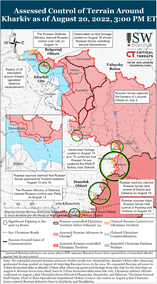 20 августа российские войска предприняли ограниченные наземные атаки к северу от Харькова, но все они потерпели неудачу. Официальные украинские источники сообщили, что российские войска пытались атаковать северо-восточнее Харькова возле Борщова, но потерпели неудачу и отступили. Городской совет Дергача сообщил, что российские войска также провели неудачный штурм Питомника к северу от Харькова. На кадрах с геолокацией, опубликованных 18 августа, видны российские силы, действовавшие в районе Дементьевки, что указывает на то, что российские войска добились лишь незначительных территориальных успехов в направлении Дементьевки к северу от Харькова, несмотря на длительные попытки захватить населенный пункт. Украинский генеральный штаб сообщил, что российские войска нанесли авиаудары в районе Русских Тышек к северу от Харькова и Золочева к северо-западу от Харькова. Глава Харьковской областной администрации Украины Олег Синегубов сообщил, что в ночь с 19 на 20 августа российские войска нанесли ракетные удары по Харькову и всей Харьковской области, в результате чего была повреждена важнейшая инфраструктура. Российские силы продолжали обстрел Харькова и близлежащих населенных пунктов.