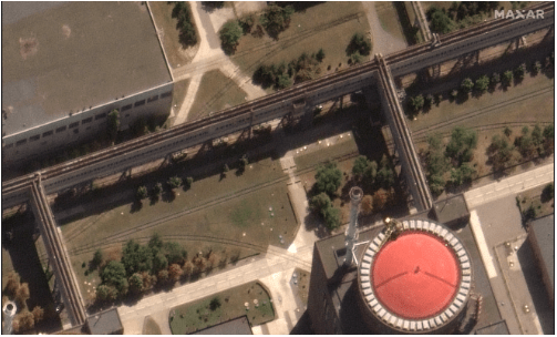На спутниковых снимках от 29 августа, предоставленных Maxar Technologies, видно, что российские боевые машины, по-видимому, укрываются под инфраструктурой ЗАЭС в непосредственной близости от корпуса реактора.