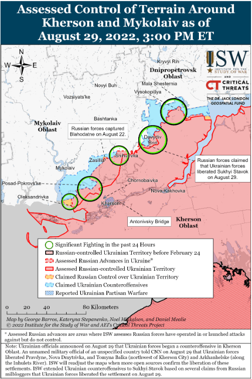 Украинские военные официальные лица объявили, что украинские силы начали контрнаступательную операцию в Херсонской области 29 августа после того, как в течение нескольких недель серьезно нарушали российские наземные линии коммуникаций (GLOC). Пресс-секретарь Южного оперативного командования Наталья Гуменюк заявила, что украинские войска «начали контрнаступательные действия на многих направлениях» и прорвали первую линию обороны на неустановленном участке. Украинская оперативная группа «Каховка» заявила, что украинские силы перерезали российские ГЛОК через реку Днепр в Херсонской области, и назвала ситуацию «блестящим шансом вернуть [украинские] территории». 109-й полк Донецкой Народной Республики (ДНР) и российские воздушно-десантные войска оставили свои позиции в неустановленном районе Херсонской области, и украинские телеграммы заявили, что эти элементы отошли со своих позиций в районе города Херсон. Ранее в конце июня 109-й полк ДНР опубликовал обращение к президенту России Владимиру Путину, назвав себя вынужденно мобилизованной частью, жалуясь на то, что его не передислоцировали с линии фронта на отдых, и осуждая плохие условия на передовой. Украинские военные чиновники также обнародовали документ ДНР от 24 июля, в котором предписывается передислоцировать 109-й, 113-й и 125-й полки ДНР в Архангельское, Высокополье, Золотую Балку и Давыдов Брод на северо-западе Херсонской области. «Каховка» также поделилась кадрами, на которых российский военнослужащий укрывается на земле под сильным артиллерийским обстрелом, заявив, что 29 августа украинские силы прорвали первую линию обороны. Украинские официальные лица не обсуждали направленность украинских контрнаступлений.