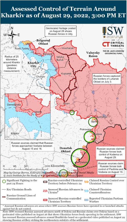 29 августа российские войска провели ограниченные наземные операции к северу от Славянска. Украинский Генштаб сообщил, что российские войска отошли после попытки наступательных операций в направлении Богородичное и Долина, в 24 и 22 км к северо-западу от Славянска. На кадрах с геолокацией, опубликованных 28 августа, видны украинские силы в Долине, что указывает на то, что предыдущие заявления России о захвате Долины были ложными. На кадрах с геолокацией также видно, как российские силы обстреливают Бражковку, в 16 км к юго-западу от Изюма, что указывает на то, что российские силы отошли от этого населенного пункта на неизвестную степень. Министерство обороны России (МО) заявило, что российские войска нанесли удары по Славянску и Райгородку к северо-востоку от Славянска на реке Северский Донец. Российские силы продолжали обстрел населенных пунктов северо-западнее и северо-восточнее Славянска.