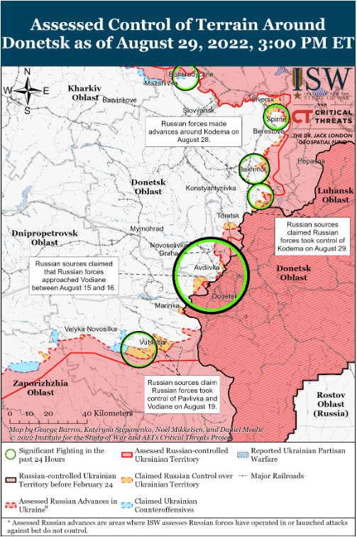 29 августа российские войска продолжали наступление в районе Донецка. Украинский генеральный штаб сообщил, что российские силы пытались, но не смогли продвинуться в направлении Первомайского и Невельского к северо-западу от Донецка и Марьинки к юго-западу от Донецка. На кадрах с геолокацией видно, как силы России и ДНР продвигаются к Каменке, в 11 км к северо-востоку от Авдеевки. На дополнительных кадрах с геолокацией видно, что украинские силы удерживают позиции на северо-западной окраине н. п. Пески, в 15 км к северо-западу от Донецка, и что в районе Песков продолжаются боевые действия. Начальник Авдеевского городского военного управления Виталий Барабаш заявил, что по состоянию на 29 августа русские контролируют только половину Песков. Российские силы продолжали обстрел Авдеевки и близлежащих населенных пунктов.