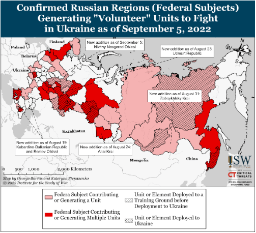 Кремль прямо признал и предпринял дальнейшие шаги по созданию инфраструктуры федерального уровня для региональных добровольческих батальонов для возмещения потерь в Украине 5 сентября. Пресс-секретарь Кремля Дмитрий Песков сообщил, что президент России Владимир Путин планирует поручить Кабинету Министров России гражданские должности россиян, которые добровольно идут на войну в Украине. Это представляет собой отход от прежнего молчания Кремля в отношении региональных усилий по мобилизации, которые позволили Кремлю представить вербовочные кампании как «добровольные местные инициативы» и изолировать этнически русские районы и ключевые городские центры от бремени формирования добровольческих батальонов. Кремль, вероятно, должен принять более прямые меры по обеспечению региональных батальонов из-за путаницы в связи с неясными или неустановленными положениями центрального правительства.
