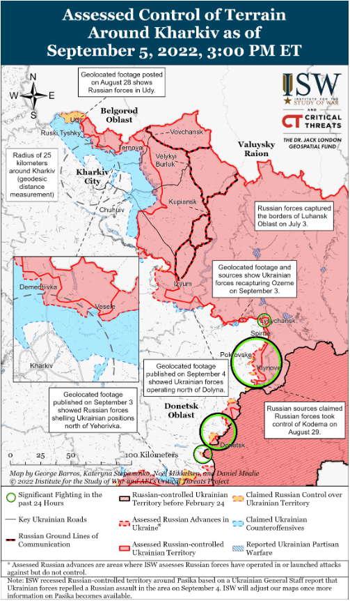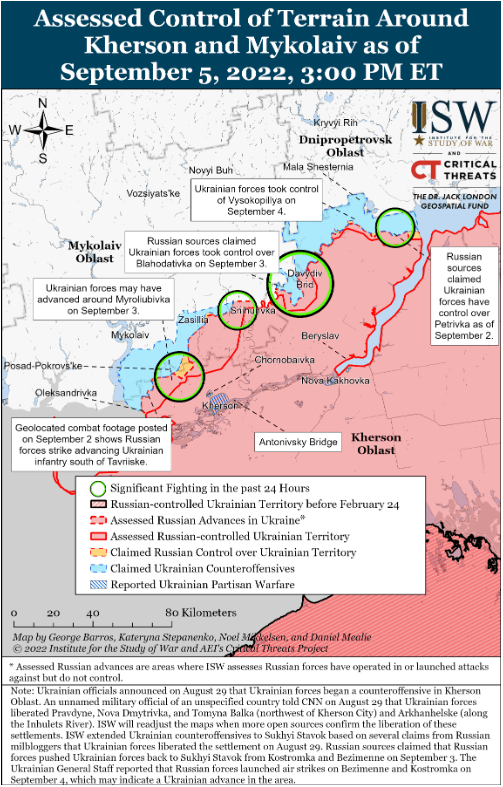 Украинские военные представители хранили оперативное молчание и не обнародовали никакой информации, касающейся наступления украинских войск в Херсонской области 5 сентября. Южное оперативное командование Украины сообщило, что украинские силы сбили два российских разведывательных беспилотника в Высокополье после того, как ранее не подтверждали, что украинские силы вошли в город. По независимой оценке ISW, украинские силы захватили город 4 сентября благодаря нескольким видеороликам в социальных сетях. Генштаб Украины сообщил, что российские войска нанесли авиаудары по Безыменному и Сухому Ставку, примерно в шести и десяти километрах к юго-востоку от украинского плацдарма за рекой Ингулец. Российские милблогеры утверждали, что российские войска отбили Костромку (село между Безыменным и Сухим Ставком), но на кадрах с геолокацией видно, как украинские танки атакуют российские позиции вокруг населенного пункта. В сочетании с кадрами с геолокацией отчет Генштаба Украины может указывать на то, что украинские силы продвинулись в районах Костромки и Безыменного. Украинский Генштаб также сообщил, что российские силы обстреляли район Нововоскресенского (примерно в 18 км к юго-востоку от Высокополья), но неясно, продвинулись ли украинские силы в районе населенного пункта.