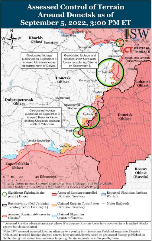 5 сентября российские силы не наносили никаких подтвержденных наземных ударов к юго-западу от Донецка или в восточной части Запорожской области и продолжали обычные воздушные и артиллерийские удары по этим районам.