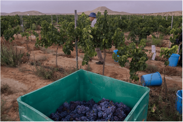 Поэтому время сбора урожая здесь наступает раньше, чем в других винодельческих районах Израиля на севере, где климат более средиземноморский. Несколько женщин-бедуинок были наняты, чтобы собрать сочные гроздья в прохладе рассвета.