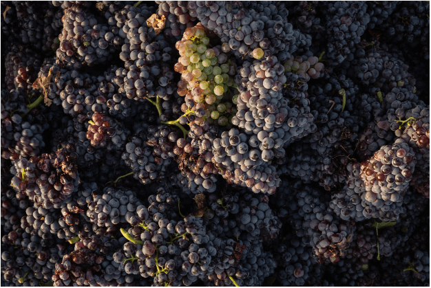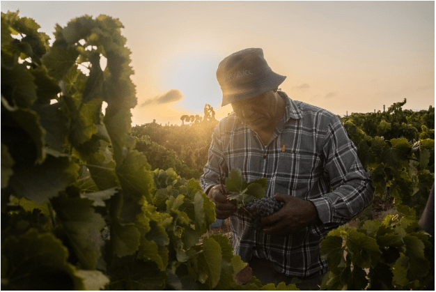 Тяжелые гроздья пурпурного винограда гренаш и сира быстро созревают на лозах под палящим солнцем пустыни. Хитрость, по словам г-на Пинто, заключается в том, чтобы найти золотую середину, в которой высокое содержание сахара уравновешивается уровнем кислотности.