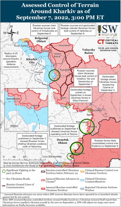 Украинские силы продвинулись не менее чем на 20 км вглубь подконтрольной России территории к северу от Изюма в сторону Купянска и 6-7 сентября отбили около 400 квадратных километров. Российские источники утверждали, что украинские силы продвигались на юго-восток по трассам E40 и N26 в направлении Изюма и Купянска соответственно. На кадрах с геолокацией видно, что украинские силы также продвигались на северо-восток по трассе Т2110 из Балаклеи, Вербовки, Яковенково, Волохова Яра (на пересечении трасс Т2210 и Е40) и в направлении Шевченково (на пересечении трасс Т2210 и N26). Российские источники утверждали, что украинские силы пытаются наступать на Савинцы (чуть севернее Залымана на трассе R78), что отрезало бы Балаклею от тыловых ГЛОК. Российские источники сообщили, что украинские силы, вероятно, стремились взять под контроль сеть GLOC, включая автомагистрали T2210, E40 и N26, чтобы создать условия для дальнейшего продвижения на юг на Изюм и на восток на Купянск. Местные источники сообщили, что украинские войска нанесли удары по Изюму и Купянску (российские источники утверждают, что они использовали HIMARS), вероятно, чтобы помешать российским войскам снабжать и укреплять линию фронта из этих городов. Российские силы обстреляли украинские тылы в Явирском, Пришибе, Андреевке, Лимане и Змиеве, все к северо-западу от Балаклеи на трассе R78.