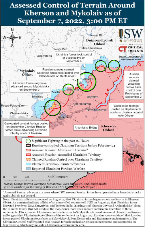 Украинские и российские источники сообщили о кинетической активности на двух основных направлениях в Херсонской области 7 сентября: в северной части Херсонской области к югу от границы с Днепропетровской областью и в западной части Херсонской области вдоль границы с Николаевской областью. Геолоцированные боевые кадры и снимки также подтверждают, что украинские войска продвинулись в Высокополье и Нововознесенское, которые находятся в пределах 5 км от границы Херсонско-Днепропетровской области. Российские источники, в том числе Министерство обороны (МО) России, непреднамеренно подтвердили, что украинские силы продвигаются в западной части Херсонской области в районе Сухой Ставок (примерно в 65 км к северо-востоку от города Херсон и вдоль реки Ингулец). Минобороны России заявило, что российские удары были направлены на сосредоточение украинских сил в Белогорке, Сухом Ставке и Андреевке, что указывает на то, что украинские войска удерживают позиции к югу от реки Ингулец. Российские источники продолжали обсуждать украинские наступательные операции в районе Сухого Ставка и окрестных населенных пунктов Безиммене, Костромка, Великий Артаков и Счастливое.