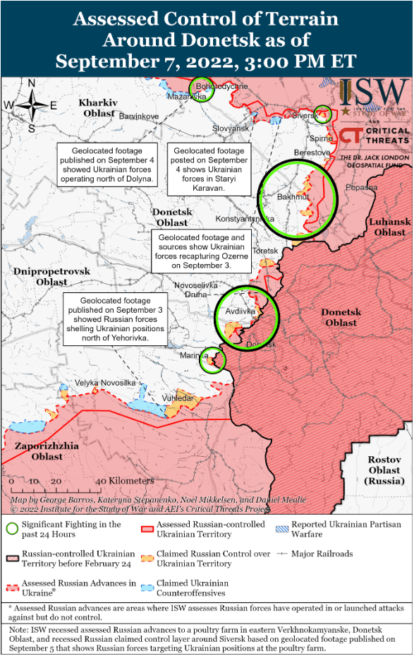 Российские войска продолжали наземные атаки к северо-востоку и югу от Бахмута 7 сентября. Украинский генеральный штаб сообщил, что российские войска пытались продвинуться на север в сторону Бахмута с окраин Горловки в районе Зайцево, Майорск и Николаевка Друга — все в пределах 20 км к югу от Бахмута. Украинский Генштаб также сообщил об атаках российских войск вблизи Веселой Долины (5 км к юго-востоку от Бахмута) и района Соледар-Бахмутское (10 км к северо-востоку от Бахмута). МО РФ подтвердило сообщения от 6 сентября о том, что российские войска полностью взяли под свой контроль с. Кодема, в 13 км к юго-востоку от Бахмута, и продолжают продвигаться на север в сторону Зайцево и южных окраин самого Бахмута. Российские войска продолжали плановые артиллерийские обстрелы Бахмута и близлежащих населенных пунктов.
