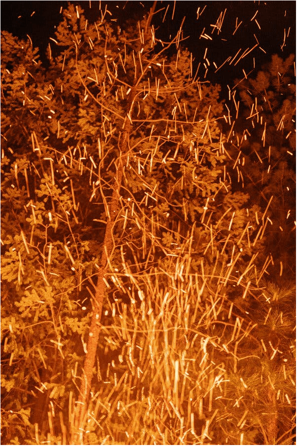 Доктор Йорк и небольшая опытная команда шли перпендикулярно склону леса, используя фонарики, чтобы нарисовать линии пламени, которые горели вверх по склону. Пейзаж быстро преобразился. Высокие деревья отбрасывали прозрачные драматические тени на завесы беловато-серого дыма. Густой туман рассеивал солнечные лучи, заливая лес глубоким оранжевым сиянием. Треск горящих кустов смешивался с низким механическим воем дрона наверху.