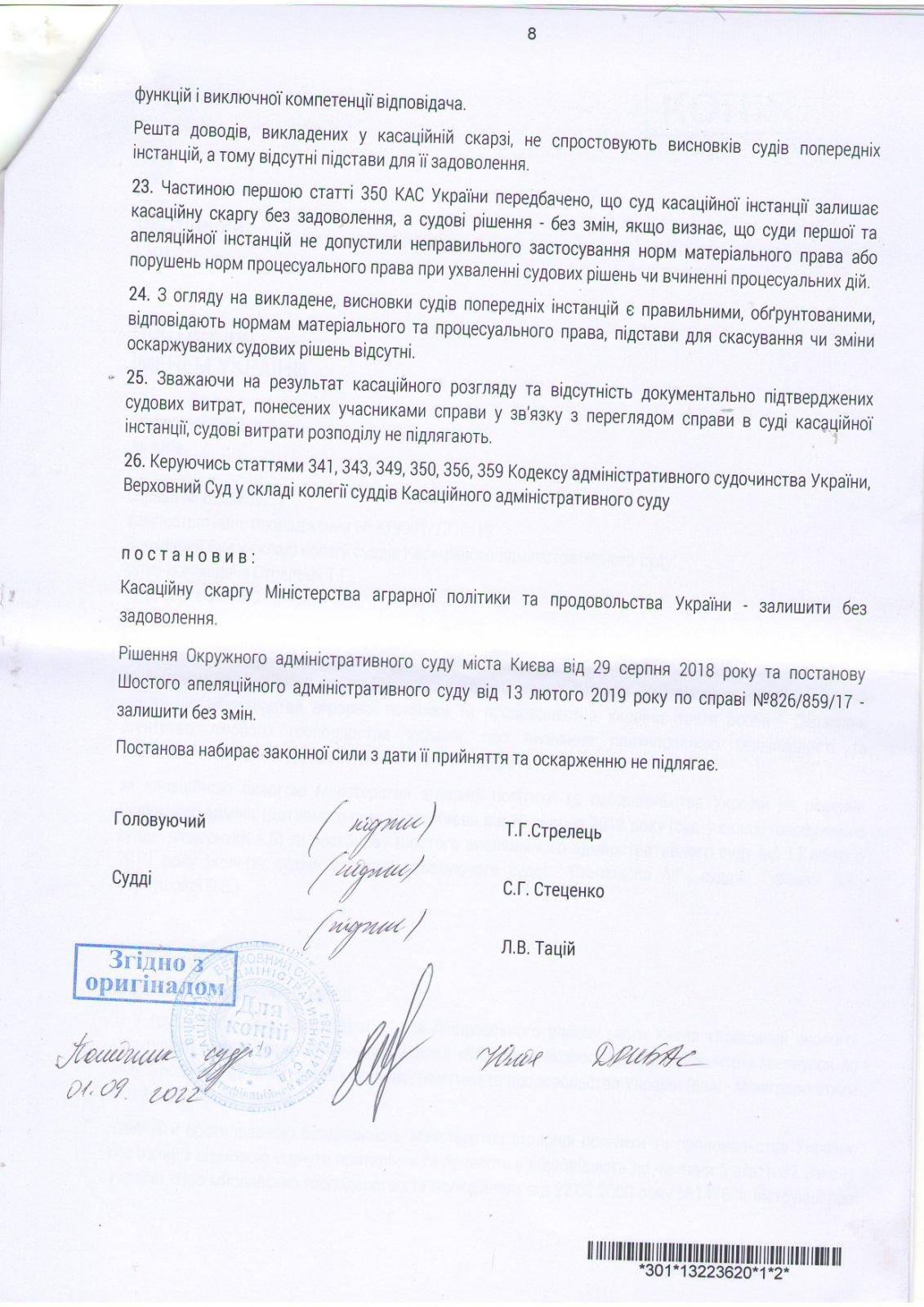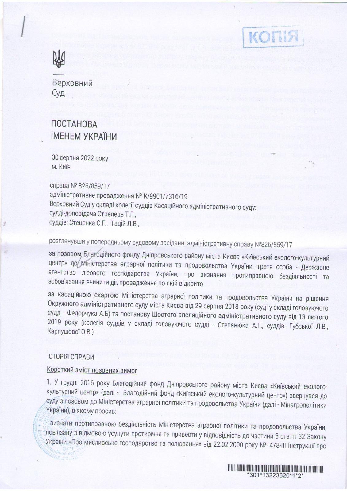 30 августа 2022 г. Верховный Суд Украины поддержал иск Киевского эколого-культурного центра ( КЭКЦ) против Министерства аграрной политики Украины, Государственного агентства лесных ресурсов Украины и стоящих за их спиной кровавых охотников .