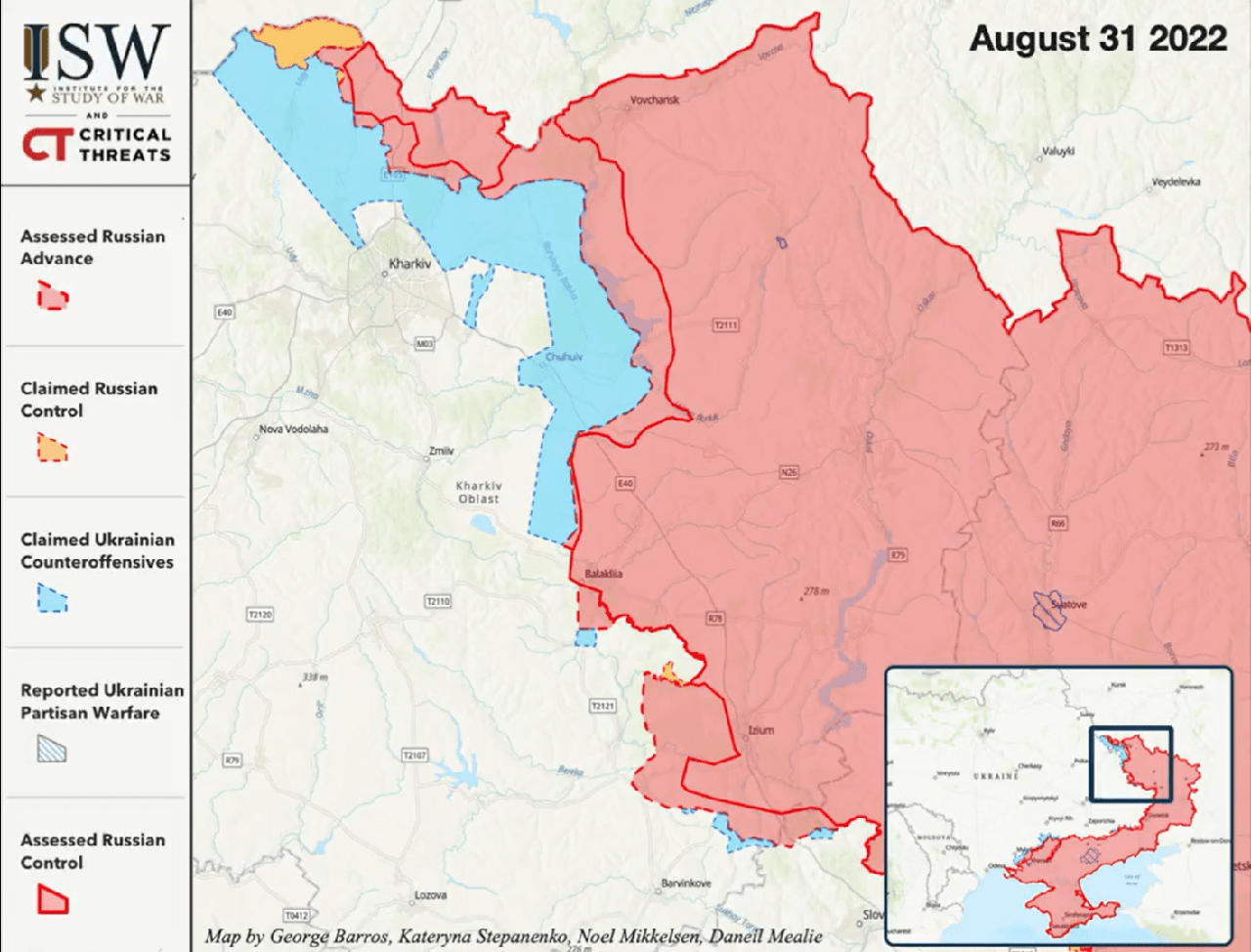 - Украинские силы в Харьковской области разрушают северное российское направление Донбасса, и украинские силы, вероятно, вернут себе Изюм в ближайшие 48 часов.