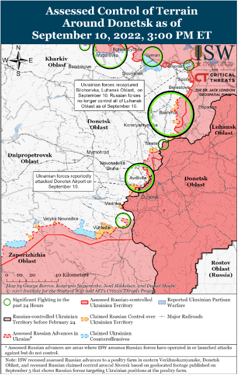 Украинское контрнаступление в Харьковской области разгромило российские силы и разрушило северное направление России на Донбассе. Российские войска не ведут контролируемый отход и спешно покидают юго-восток Харьковской области, чтобы избежать окружения вокруг Изюма. Российские силы ранее ослабляли северное направление Донбасса, перебрасывая подразделения из этого района на юг Украины, что усложняло усилия по замедлению продвижения украинцев или, как минимум, развертыванию сил прикрытия для отступления. Украинские завоевания не ограничиваются районом Изюма; Сообщается, что 10 сентября украинские силы захватили Великий Бурлук, в результате чего украинские силы оказались в пределах 15 километров от международной границы. Украинские силы прорвали российские позиции на глубину до 70 километров в некоторых местах и захватили более 3000 квадратных километров территории за последние пять дней с 6 сентября — больше территории, чем российские войска захватили во всех своих операциях с апреля.