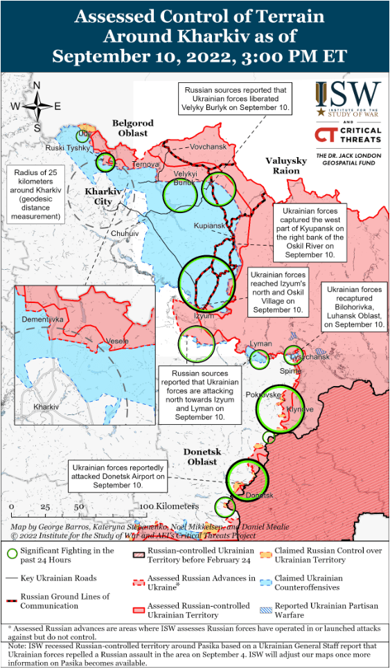Украинские силы достигли северной окраины Изюма 10 сентября и, скорее всего, вернут город в течение следующих 48 часов, если они еще этого не сделали. Российские и украинские источники сообщили, что украинские войска еще не вошли в Изюм, и в основном сообщалось, что российские войска отходят из города. Российские источники сообщили, что российские военные перебросили подкрепления для прикрытия отхода из Изюма на левый берег реки Оскол. Наступление украинских войск на север перерезало наиболее важные наземные пути сообщения (ГЛОК) российских войск с Изюмом. Российские силы теперь должны полагаться на неоптимальные пути на юг и юго-восток, которые проходят через труднопроходимую местность и через реки Северский Донец и Оскол для отвода войск.