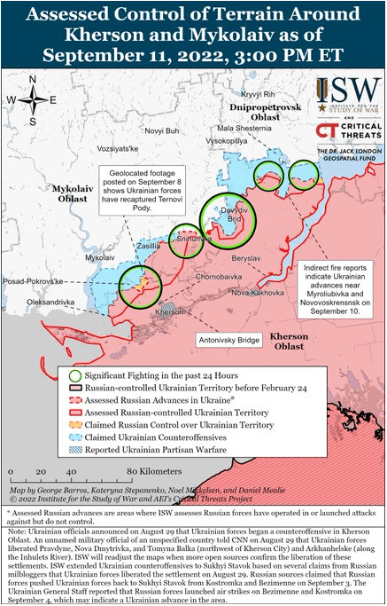 Ни российские, ни украинские источники не обсуждали конкретную кинетическую активность на линии фронта Херсон-Николаев 11 сентября. Российский милблогер расплывчато заявил, что украинские силы ведут позиционные бои в неустановленных местах. Однако, несмотря на отсутствие конкретных описаний боевых действий в конкретных районах, украинские войска, вероятно, продолжают угрожать российскому контролю над местностью вдоль линии фронта. Украинский Генштаб заявил, что российские войска нанесли удар по украинским позициям в Брускинском, примерно в 75 км к северо-востоку от города Херсон, вдоль критической трассы Т2207, которая впадает в Новую Каховку. Этот удар может указывать на то, что украинские силы продвигаются к востоку от близлежащего Сухого Ставка и продолжают попытки перекрыть российские наземные пути сообщения в западной части Херсонской области.
