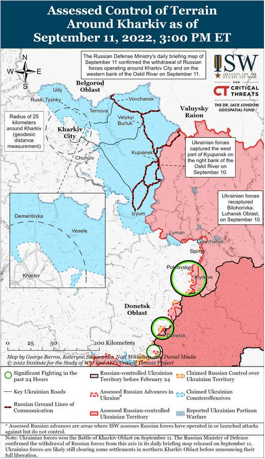 Информационная карта Минобороны России от 11 сентября подтвердила, что российские войска выводятся из населенных пунктов вокруг Харькова, из северной части Харьковской области и населенных пунктов на западном берегу реки Оскол. Российские источники и блогеры определили реку Оскол, протекающую через Купянск и Изюм, как новую линию фронта на направлении, и российские войска, вероятно, также продолжают действовать на восточном берегу реки Северский Донец к юго-востоку от Изюма. Кадры из геолокации и социальных сетей подтвердили, что украинские силы вошли в Волчанск и Великий Бурлук, перерезав российские наземные пути сообщения (ГЛОК) вдоль трассы T2104, и достигли межгосударственной границы к северу от Харькова. На кадрах с геолокацией также видно, что 11 сентября украинские силы взяли под свой контроль Изюм и населенные пункты к югу и юго-западу. Российские войска, вероятно, покинули этот район в спешке, а сообщения в социальных сетях показывают брошенные танки и другую тяжелую военную технику возле Изюма, что свидетельствует о том, что российским войскам не удалось организовать последовательное отступление. Российские источники утверждают, что украинские войска продолжают попытки форсировать реку Северский Донец к северо-востоку от Славянска и войти в Лиман. Российский милблогер сообщил, что российские войска обстреливают украинцев в районе Лимана, но российские войска сохраняют контроль над населенным пунктом, несмотря на попытки украинского наступления. Боевые кадры, снятые в Белогоровке Луганской области 11 сентября, подтверждают, что украинские войска отбили позиции в Луганской области. Украинские солдаты на кадрах, похоже, прячутся от артиллерийских обстрелов, что указывает на то, что российские войска сейчас обстреливают позиции в Белогоровке.