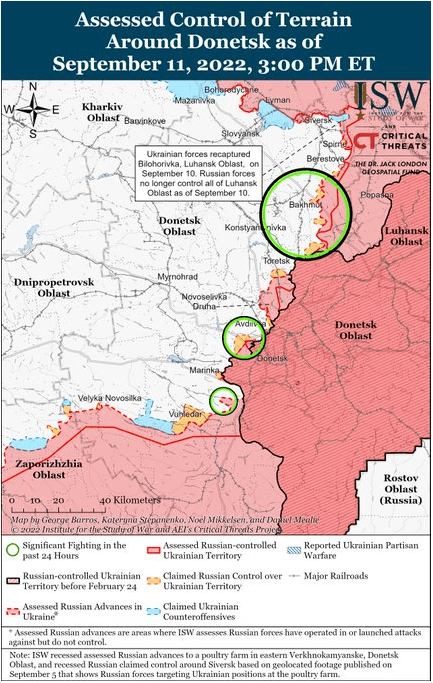 11 сентября российские войска продолжили наземные атаки в Донецкой области. Генштаб Украины сообщил, что украинские силы отразили наземные атаки российских войск в различных населенных пунктах вблизи Бахмута и Авдеевки. Дальнейшее размещение российских сил в относительно небольших и незначительных населенных пунктах в Донецкой области, вероятно, повредит способности российских сил укрепить позиции для защиты от продолжающегося контрнаступления украинских войск в Харьковской области. Продолжение наступательных операций в районе Бахмута и Авдеевки не может компенсировать потери России на юге Украины и в Харьковской области или добиться достаточно значительных успехов, чтобы оправдать их продолжение. Российское военное руководство, по-видимому, не в состоянии приспособиться к этой реальности, поскольку оно продолжает бросать войска в атаки на крошечные деревни недалеко от Бахмута и Авдеевки. Российские источники также утверждали, что украинские силы начали усиление и разминирование района Угледар на западе Донецкой области. Российские силы продолжали плановый обстрел вдоль линии соприкосновения в Донецкой области.