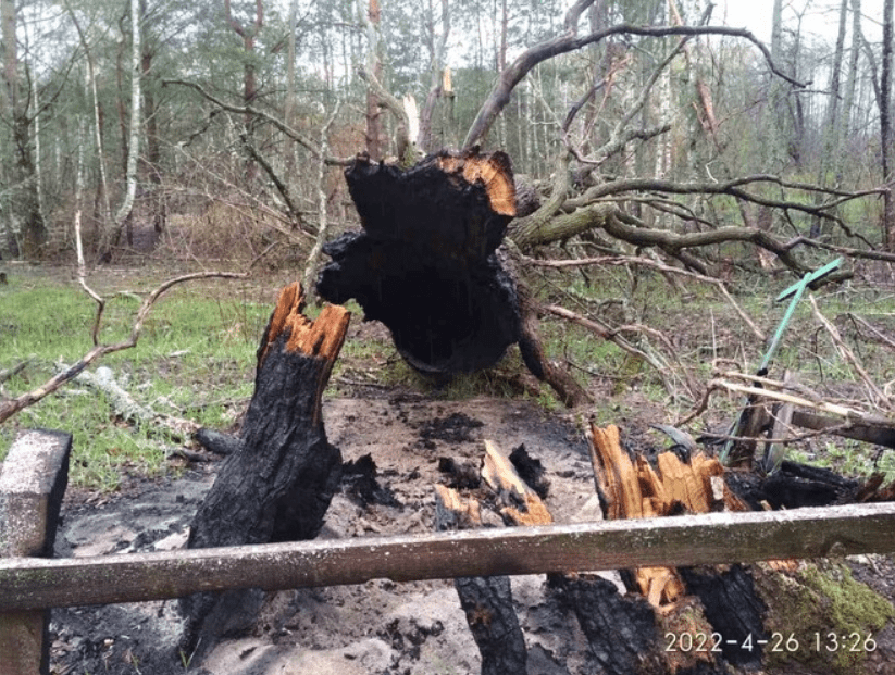 Еще одним печальным фактом войны стала утрата известной природной красоты заповедника – 500-летнего дуба. Высота дерева достигала более 25 метров. Дуб был уничтожен во время налета.. Об этом памятнике природы знали все местные жители и туристы, посетившие дерево. Столетний дуб считался визитной карточкой заповедника.500-летний дуб после налета.